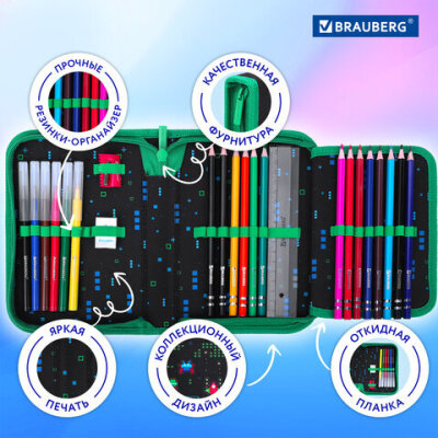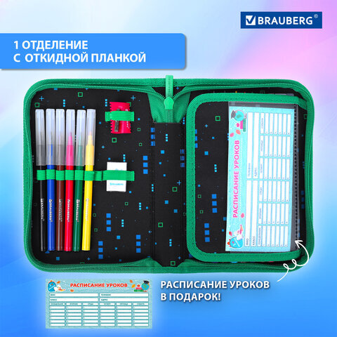 Пенал BRAUBERG с наполнением, 1 отделение, 1 откидная планка, 24 предмета, 21х14 см, "Space strike", 273534