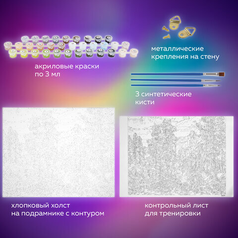| Комплектация | акриловые краски, кисть, крепеж, лист бумаги для тренировки, холст на подрамнике |