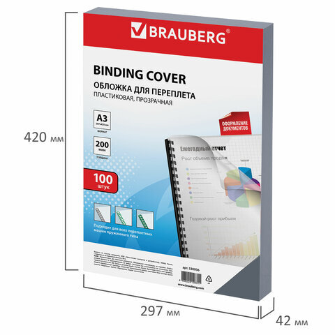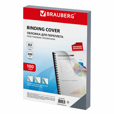 Обложки пластиковые для переплета БОЛЬШОЙ ФОРМАТ А3, КОМПЛЕКТ 100 шт., 200 мкм, прозрачные, BRAUBERG, 530936