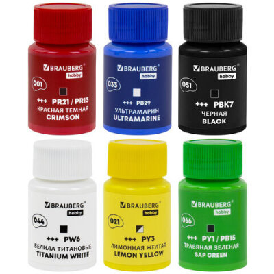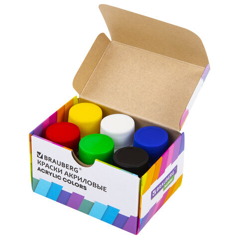 Краски акриловые художественные 6 цветов в банках по 22 мл, BRAUBERG HOBBY, 192409
