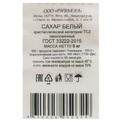 Сахар-песок в мешках по 5 кг. Произведен в России.