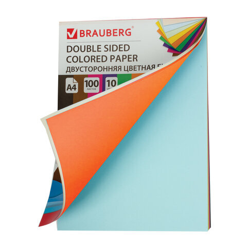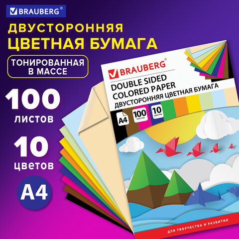 Цветная бумага А4 ТОНИРОВАННАЯ В МАССЕ, 100 листов 10 цветов, склейка, 80 г/м2, BRAUBERG, 210х297 мм, 124715