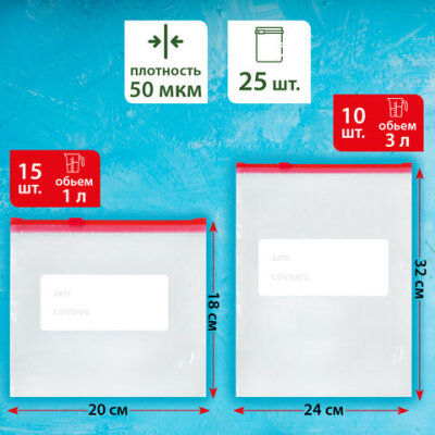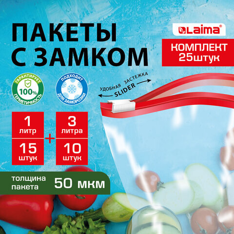 Пакеты для заморозки продуктов, КОМПЛЕКТ 25 шт. (15/1 л, 10/3 л), с замком "слайдер", LAIMA