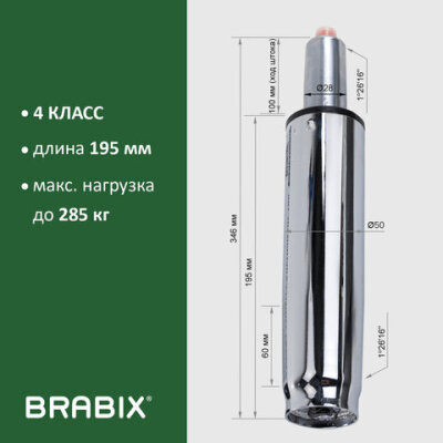 Газлифт прочный BRABIX HD-100 короткий, ХРОМ, в открытом виде 346 мм, d 50 мм, класс 4, 533077