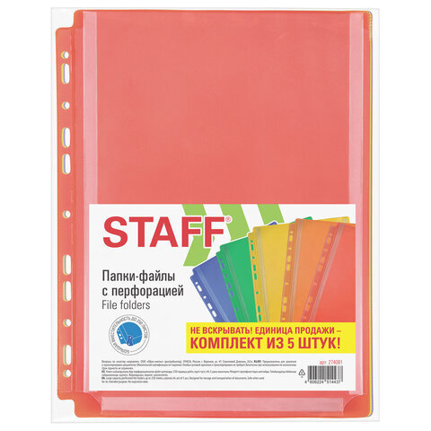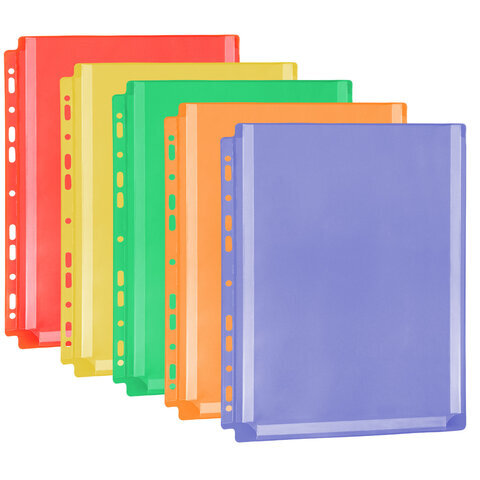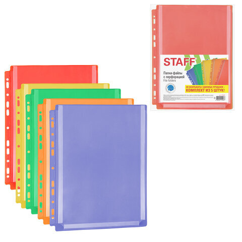 Папки-файлы с перфорацией БОЛЬШОЙ ВМЕСТИМОСТИ до 250 листов, ЦВЕТНЫЕ, А4, КОМПЛЕКТ 5 шт., STAFF, 274081