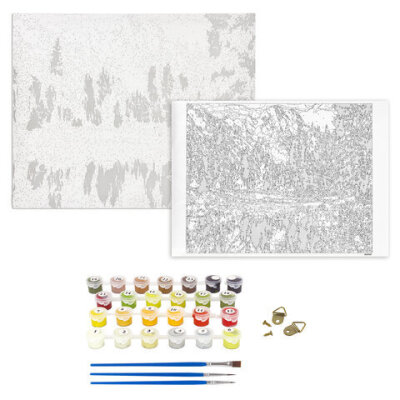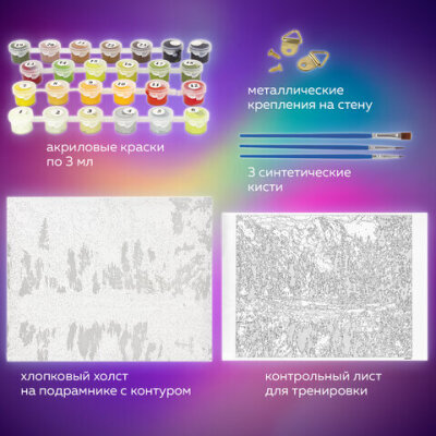 | Комплектация | акриловые краски, кисть, крепеж, лист бумаги для тренировки, холст на подрамнике |