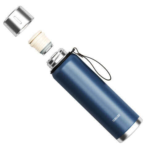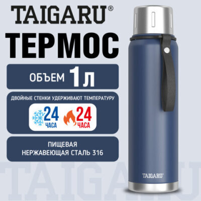 Термос 1 л TAIGARU (ТАЙГАРУ) CHOICE, нержавеющая сталь SUS316, крышка/кружка, ремешок, синий матовый, 700313