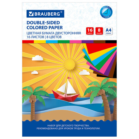 Цветная бумага А4 2-сторонняя офсетная, 16 листов 8 цветов, на скобе, BRAUBERG, 200х275 мм, "Кораблик", 129925