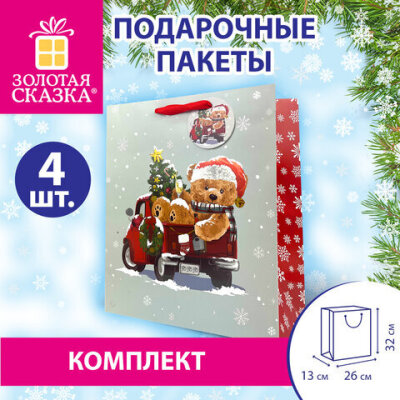 Пакет подарочный КОМПЛЕКТ 4 штуки новогодний 26x13x32 см, "Новогодний мишка", ЗОЛОТАЯ СКАЗКА, 592121