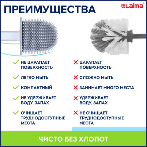 Надоело использовать непрактичные щетки для унитазов с жесткими волокнами, которые быстро царапают поверхность? Силиконовый ершик для унитаза LAIMA – незаменимый помощник в чистке унитаза. Удаляет загрязнения даже в труднодоступных местах!