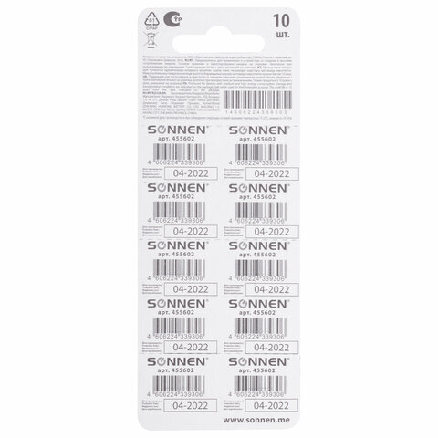 Батарейка алкалиновая "таблетка" 1 шт., SONNEN Alkaline, 189A (G10, LR54), блистер, отрывной блок, 455602