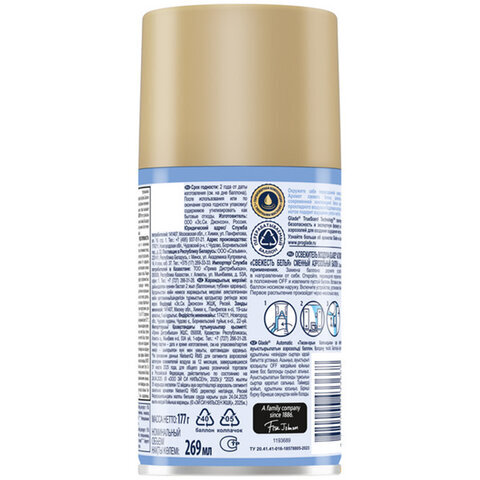 Аромат свежего белья, дополненный современной композицией белых цветов, прохладного воздуха и бодрящих цитрусовых ноток. GLADE гарантирует безопасность и экспертную формулу своих аэрозолей.