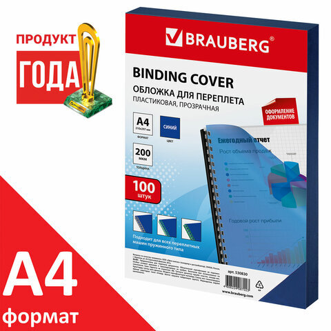 Обложки пластиковые для переплета, А4, КОМПЛЕКТ 100 шт., 200 мкм, прозрачно-синие, BRAUBERG, 530830
