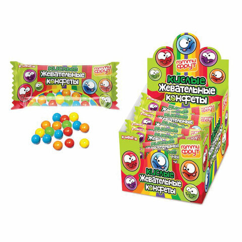 Жевательные конфеты ГАММИ ФРУТ КОНФИТОЙ в виде маленьких шариков в разноцветной хрустящей глазури. В пакете ассорти из кисло-сладких вкусов яблока, апельсина, голубики, клубники и лимона.