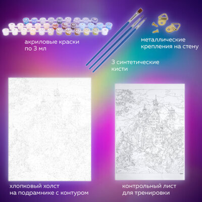 | Комплектация | акриловые краски, кисть, крепеж, лист бумаги для тренировки, холст на подрамнике |