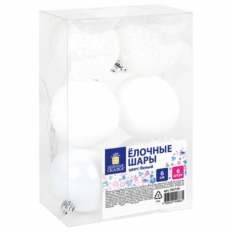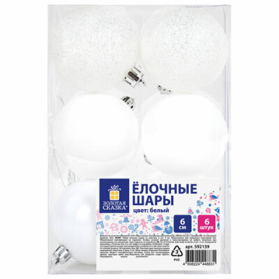 Шары ёлочные 6 шт., 6 см, "Trio", пластик, БЕЛЫЕ (глянец, матовый, глиттер), ЗОЛОТАЯ СКАЗКА, 592159
