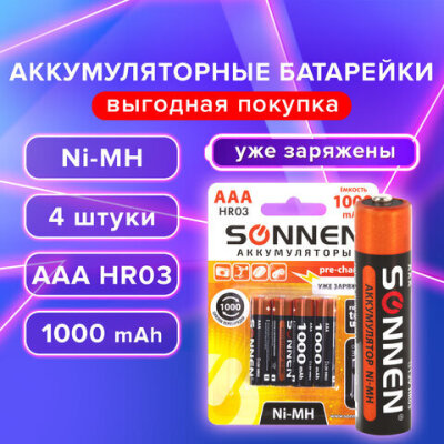 Батарейки аккумуляторные Ni-Mh мизинчиковые КОМПЛЕКТ 4 шт., AAA (HR03) 1000 mAh, SONNEN, 455610
