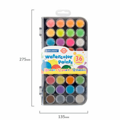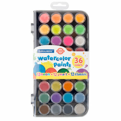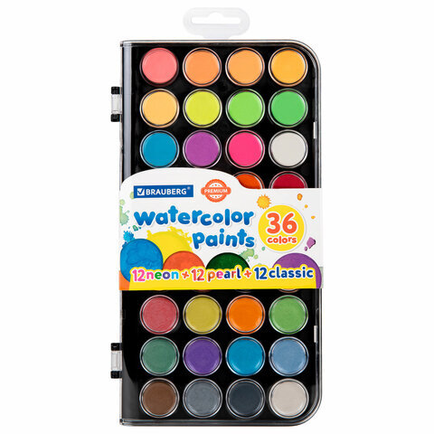 Краски акварельные BRAUBERG "PREMIUM" 36 цветов (12 базовых + 12 неоновых + 12 металлик) пенал, 191807