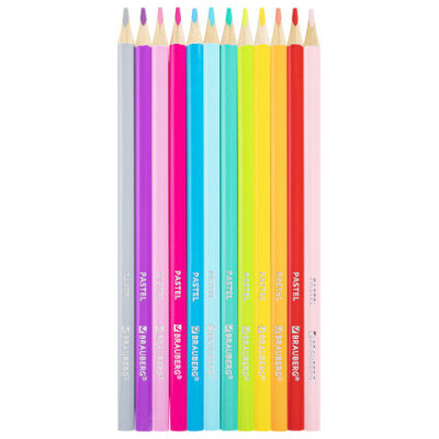 Карандаши цветные BRAUBERG PASTEL, 12 пастельных цветов, трехгранные, грифель 3 мм, натуральное дерево, 181850