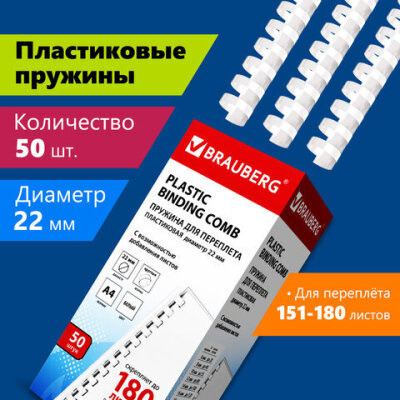 Пружины пластиковые для переплета, КОМПЛЕКТ 50 шт., 22 мм (для сшивания 151-180 л.), белые, BRAUBERG, 530927
