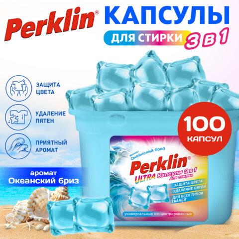 Капсулы для стирки белья PERKLIN (ПЕРКЛИН) "ОКЕАНСКИЙ БРИЗ" концентрат 3 в 1 с кондиционером 100 шт., 700128