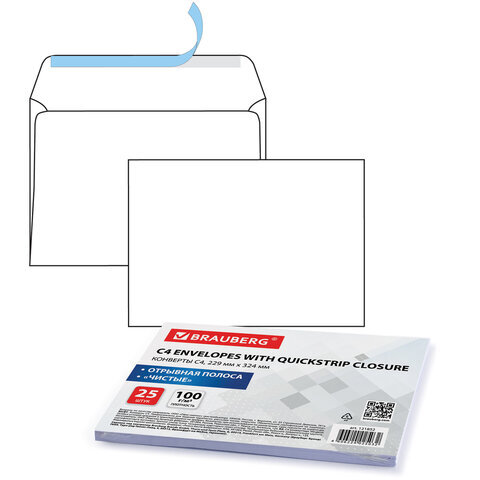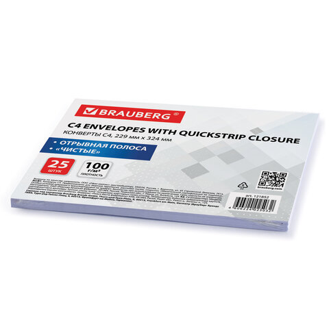 Конверты С4 (229х324 мм), отрывная лента, 100 г/м2, КОМПЛЕКТ 25 шт., BRAUBERG, 121852