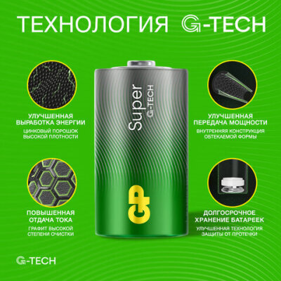 Батарейки КОМПЛЕКТ 2 шт., GP Super G-Tech, D (LR20, 13А), алкалиновые, в пленке, 13A-OS2