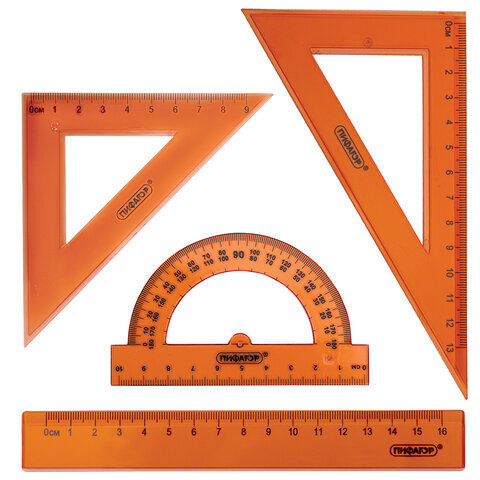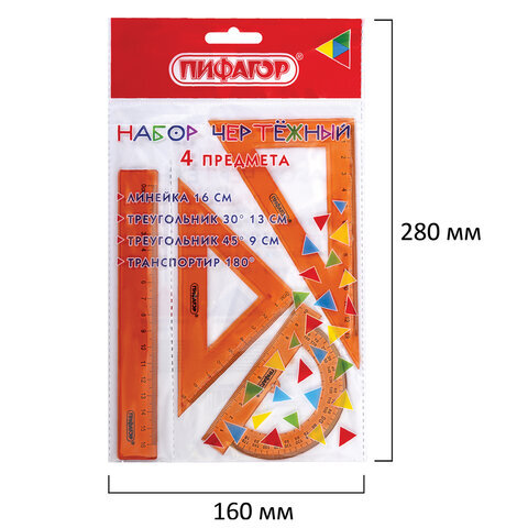 Набор чертежный ПИФАГОР (линейка 16 см, 2 треугольника, транспортир), неоновый, прозрачный, ассорти, 210851