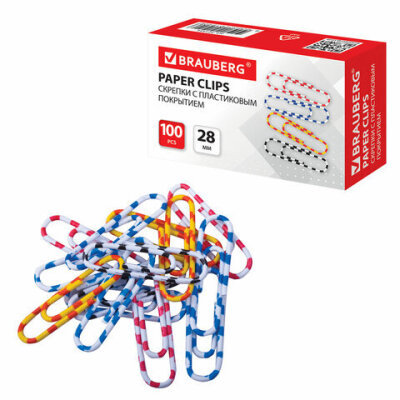 Скрепки BRAUBERG, 28 мм с цветными полосками, 100 шт., в картонной коробке, 221534