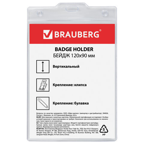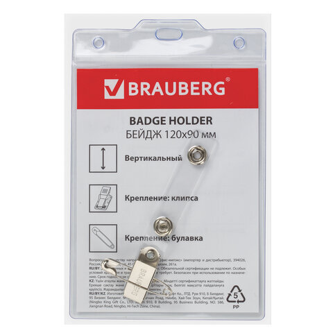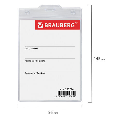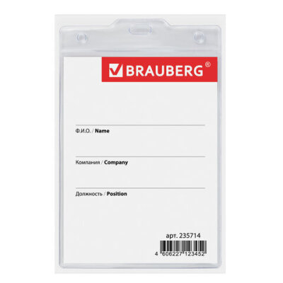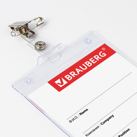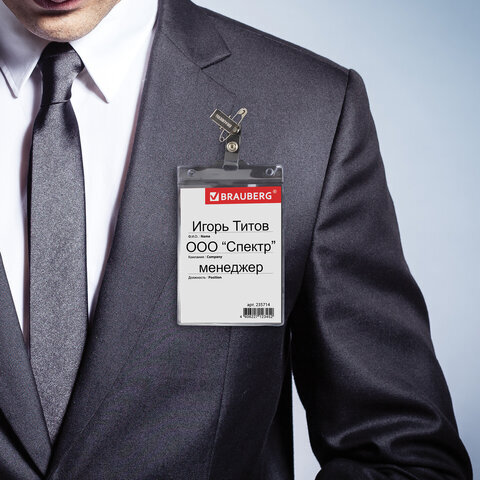 Вертикальный БОЛЬШОЙ бейдж BRAUBERG с клипсой и булавкой для именной карточки предназначен для идентификации сотрудников в компаниях, а также на семинарах, тренингах, презентациях и других мероприятиях.