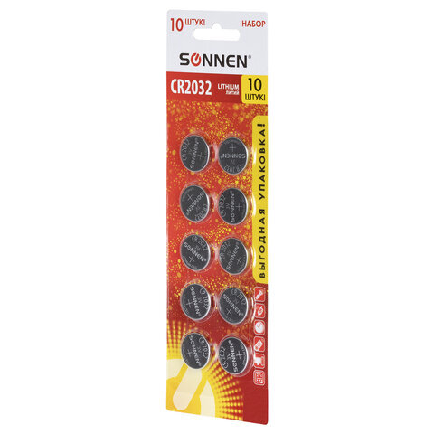 Батарейки литиевые SONNEN Lithium CR2032, "таблетки, дисковые, кнопочные", КОМПЛЕКТ 10 шт., блистер, 457143