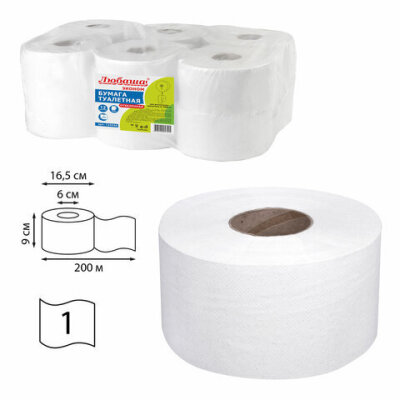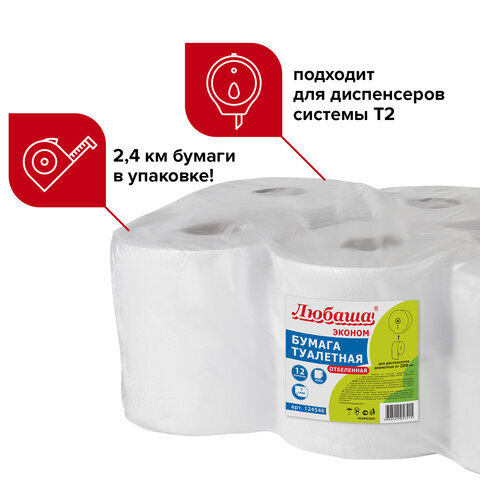 Бумага туалетная ЛЮБАША (Система T2) 1-слойная 12 рулонов по 200 метров, отбеленная, 124546, 124546 (МП-40)