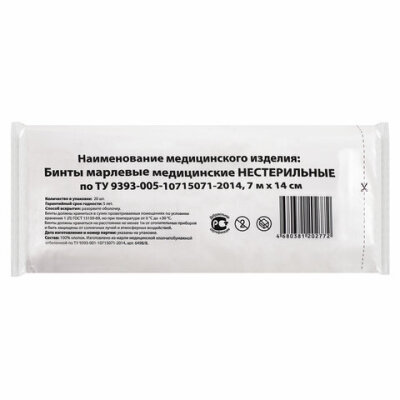 Бинт медицинский марлевый нестерильный в групповой упаковке изготовлен из впитывающего материала - марли медицинской плотностью 30 г/м2.
