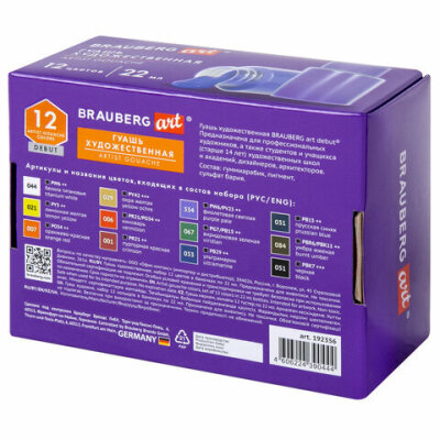 Художественная гуашь серии BRAUBERG ART DEBUT предназначена для живописи, художественных и декоративно-оформительских работ. Обладает высокой укрывистостью. Быстро сохнет, сохраняет яркий и насыщенный цвет.