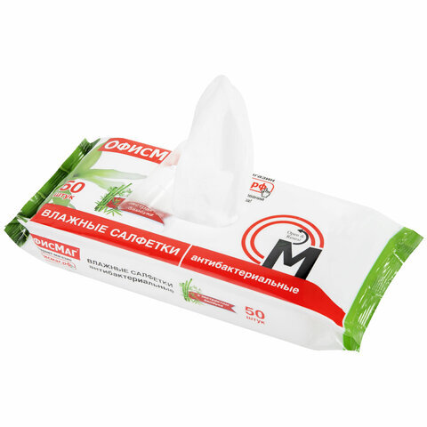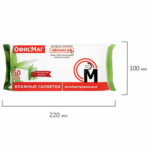 Салфетки влажные, 50 шт., АНТИБАКТЕРИАЛЬНЫЕ, с экстрактом бамбука, ОФИСМАГ, 125962