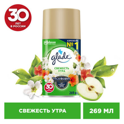 Аромат сменного баллона GLADE "Свежесть утра" с нотами зеленого яблока, весенних цветов и утренней росы подарит заряд бодрости и хорошее настроение на весь день.