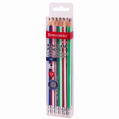 Набор карандашей чернографитных BRAUBERG "G-100" 12 шт., HB, с ластиком, корпус ассорти, 181716