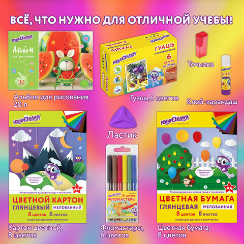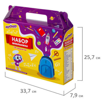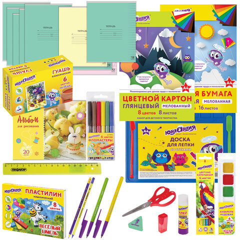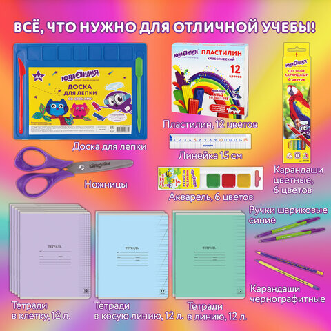 Набор канцелярских принадлежностей ЮНЛАНДИЯ "К ШКОЛЕ ГОТОВ" для выпускников детского сада и учеников начальной школы в красочной упаковке. Скомплектован на основе рекомендаций учителей.