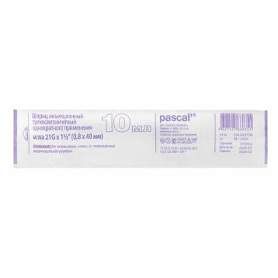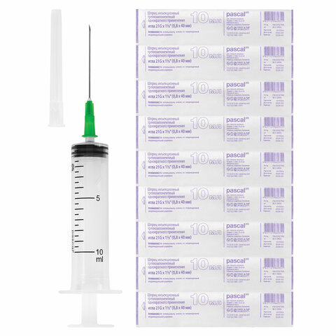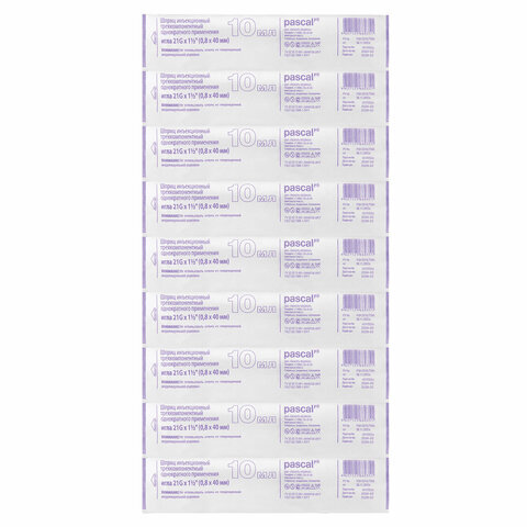 Шприц 3-х компонентный PASCAL, 10 мл, КОМПЛЕКТ 100 шт., в пакете, игла 0,8х40 – 21G, 120508