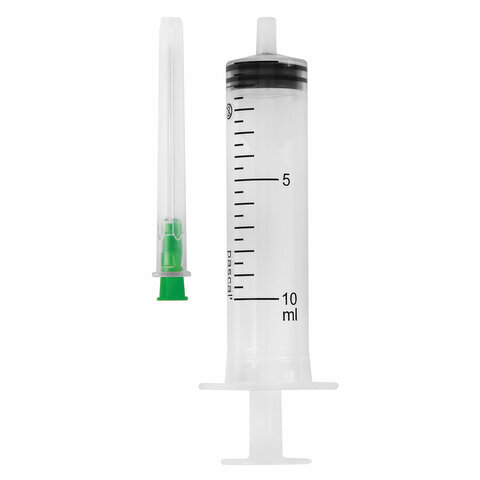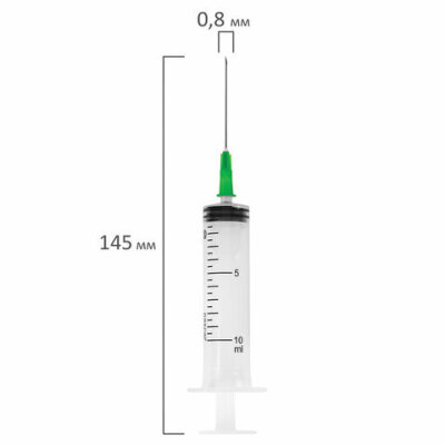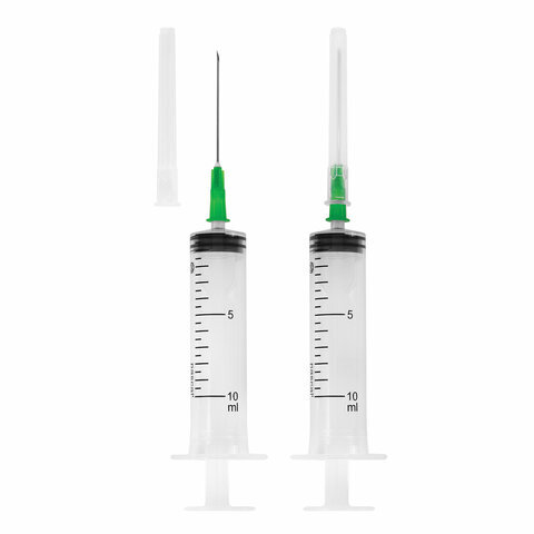 Трехкомпонентный одноразовый шприц изготовлен из специального полипропилена. Нетоксичен, апирогенен. Объем – 10 мл, размер иглы – 21G.