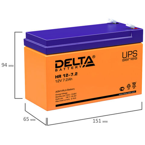 Аккумуляторная батарея для ИБП любых торговых марок, 12 В, 7,2 Ач, 151х65х94 мм, DELTA, HR 12-7.2