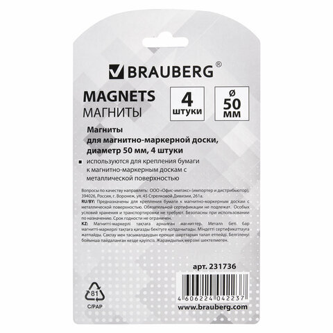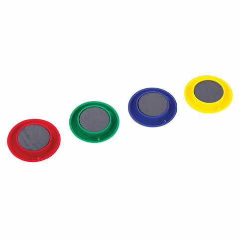 Магниты БОЛЬШОГО ДИАМЕТРА, 50 мм, КОМПЛЕКТ 4 штуки, цвет АССОРТИ, в блистере, BRAUBERG, 231736
