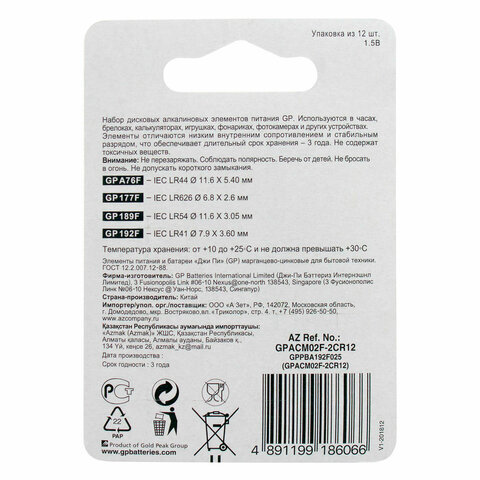 Батарейки НАБОР 12 шт. (А76 – 4 шт., 177 – 4 шт., 189 – 2 шт., 192 – 2 шт.), GP Alkaline, блистер, ACM02F-2CR12