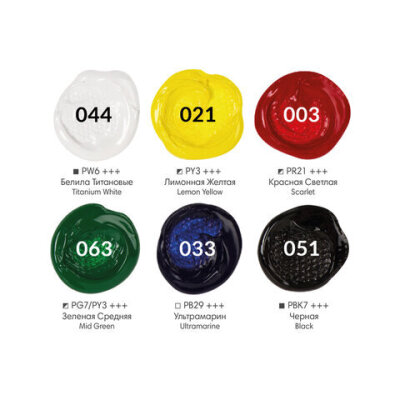 | Цвет | белила титановые (044), зеленый средний (063), красная светлая (003), лимонная желтая (021), ультрамарин (033), черный (051) |
