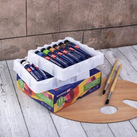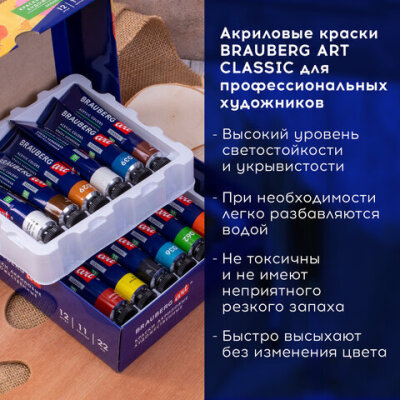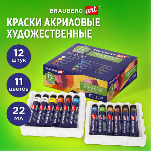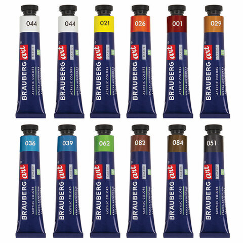 Краски акриловые художественные BRAUBERG ART CLASSIC, НАБОР 12 шт, 11 цветов, в тубах 22 мл, 191721