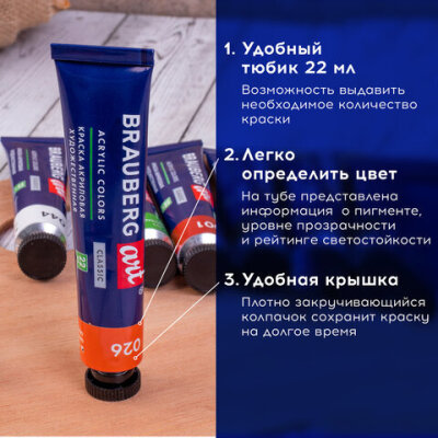 Акриловая художественная краска BRAUBERG ART CLASSIC - профессиональная серия. Предназначена для живописи и декоративных работ. Легко наносится практически на любую поверхность. Яркий и насыщенный цвет. Быстрое высыхание без изменения цвета.