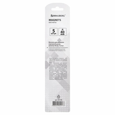Магниты БОЛЬШОГО ДИАМЕТРА, 40 мм, КОМПЛЕКТ 5 штук, цвет АССОРТИ, в блистере, BRAUBERG, 231730