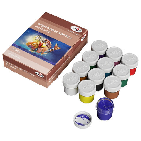 Краски акриловые декоративные ГАММА "Хобби", 12 цветов по 20 мл, в баночках, 3012198