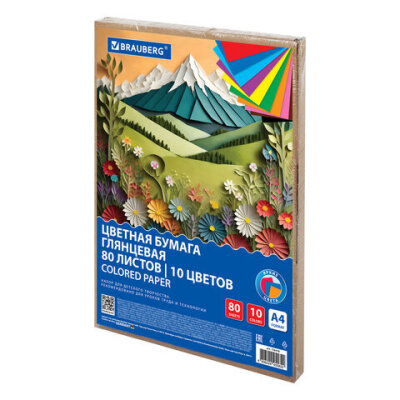 Цветная бумага А4 мелованная, 80 листов, 10 цветов, в коробе, BRAUBERG, 200х290 мм, "Горы", 116419