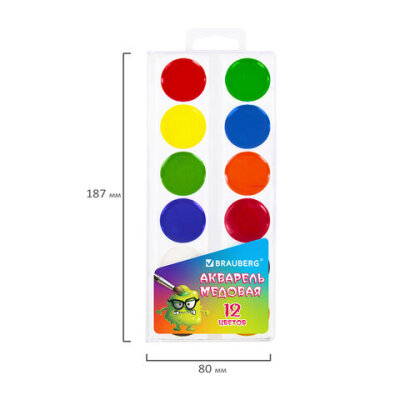 Краски акварельные BRAUBERG "МОНСТРИКИ", медовые, 12 цветов, круглые кюветы, 192641